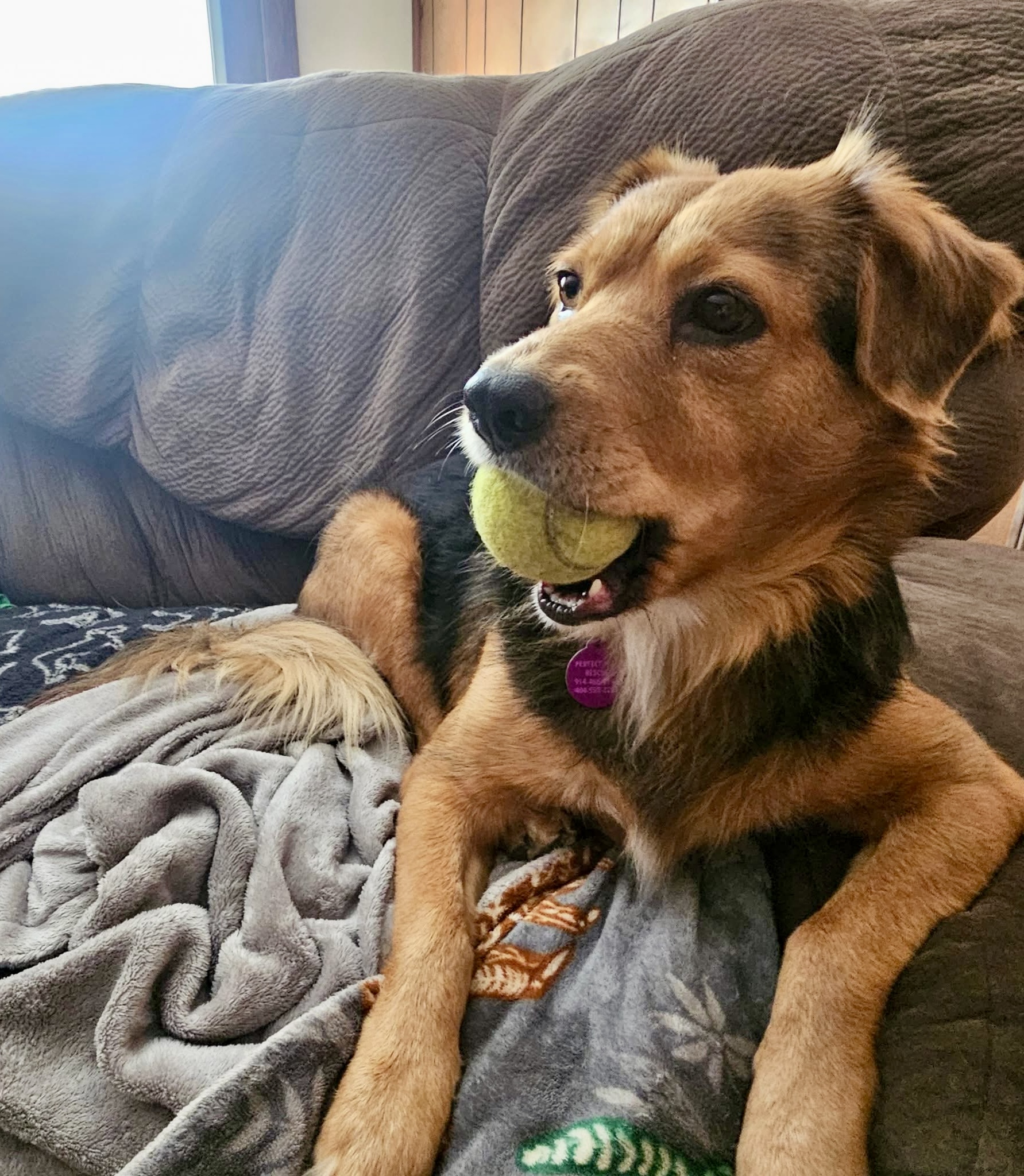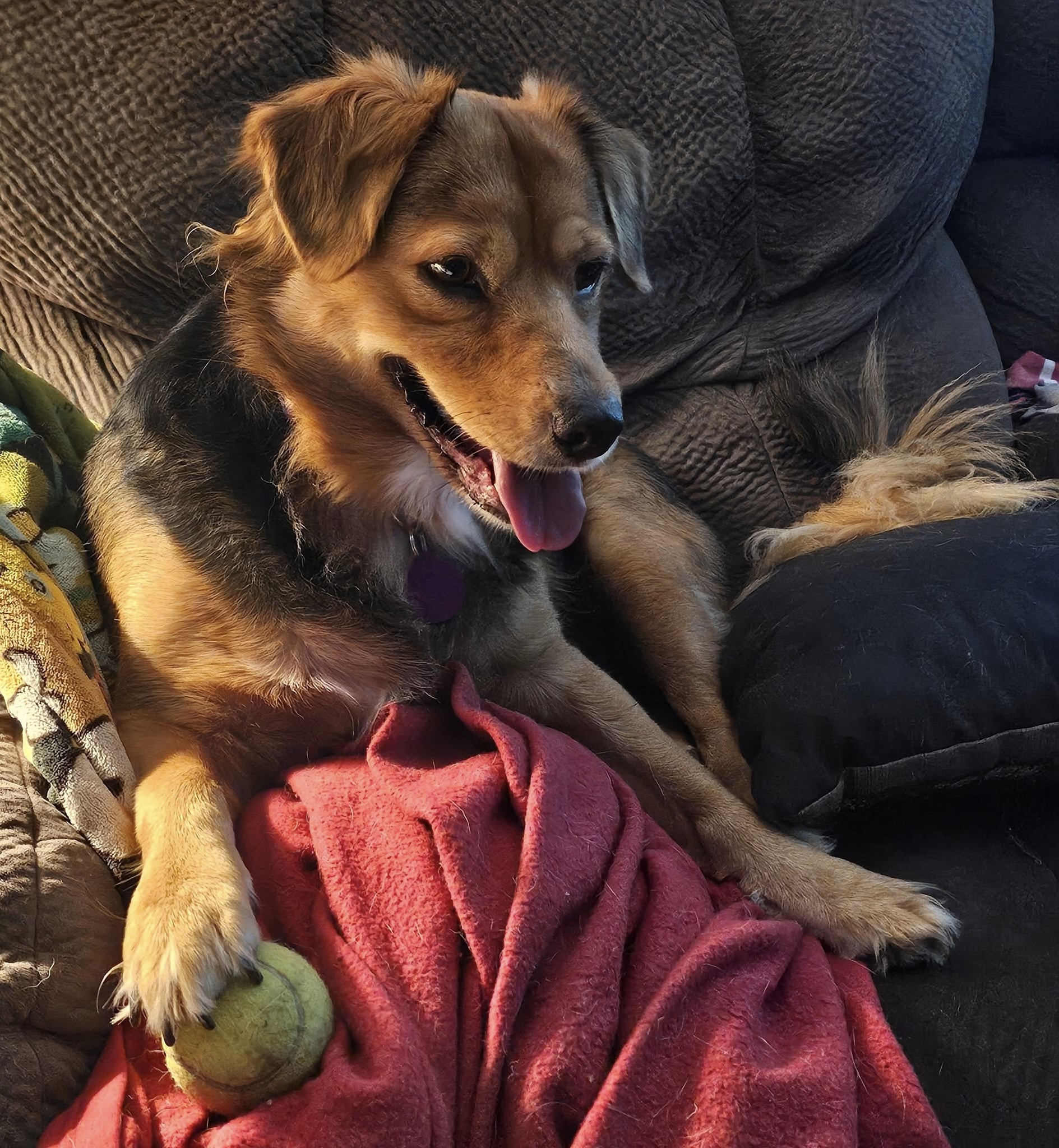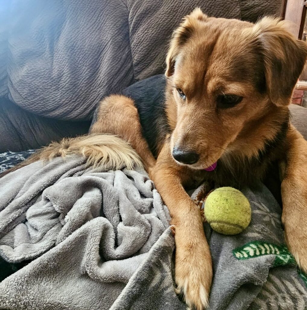 While she’s not big on toys, she loves tennis balls 🎾 — her favorite game is when you toss one for her, and she proudly carries it off to keep it close while she relaxes.