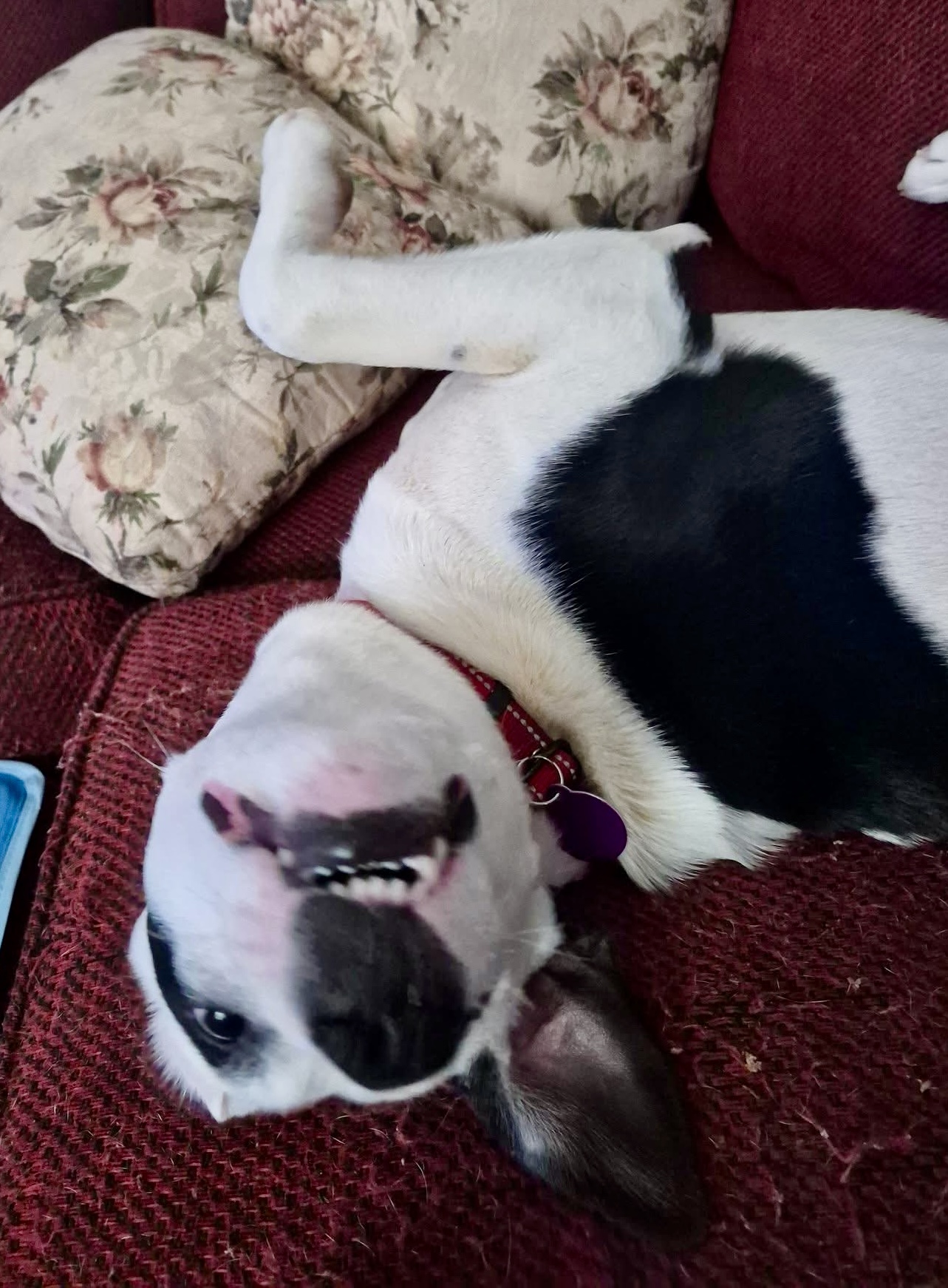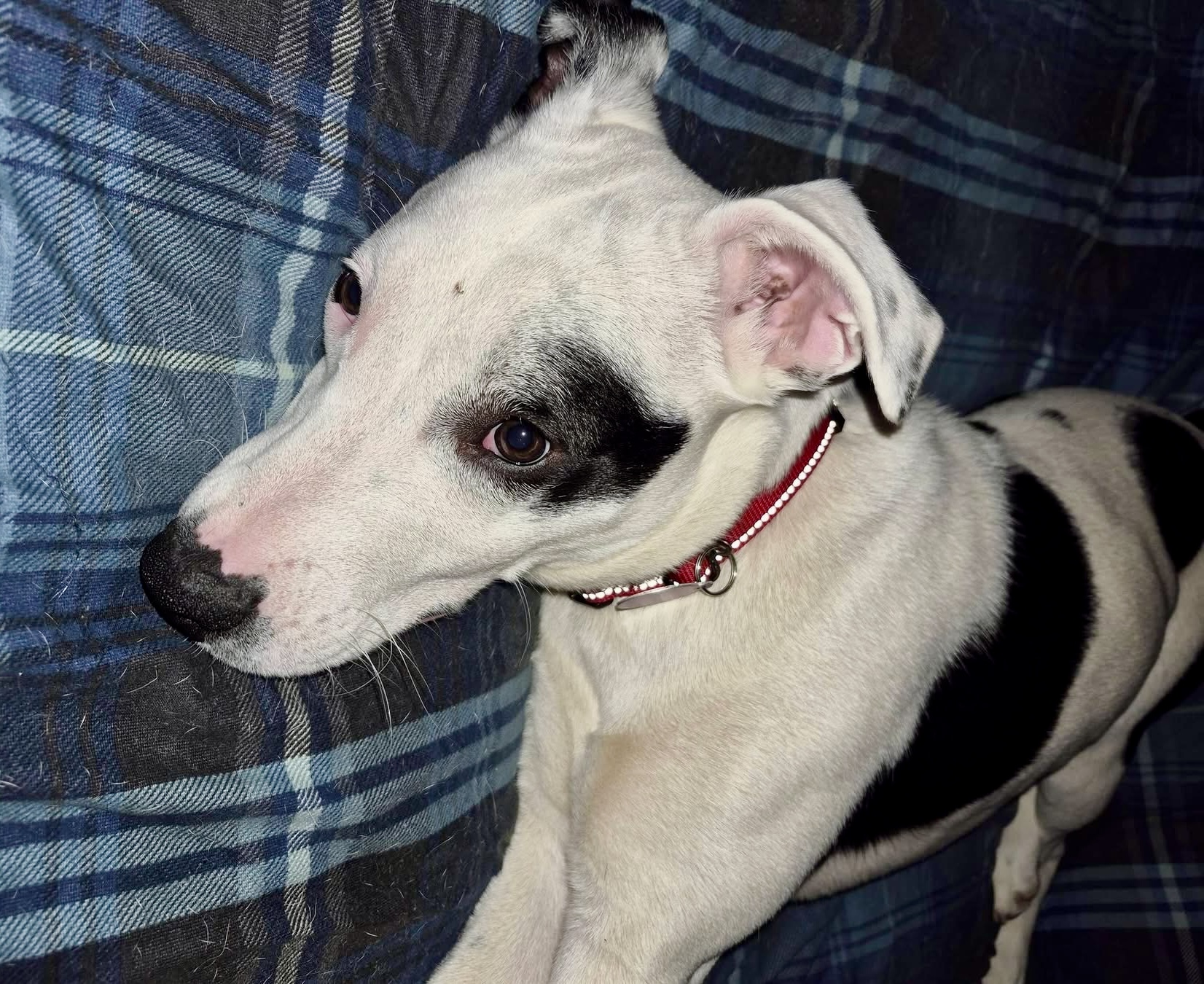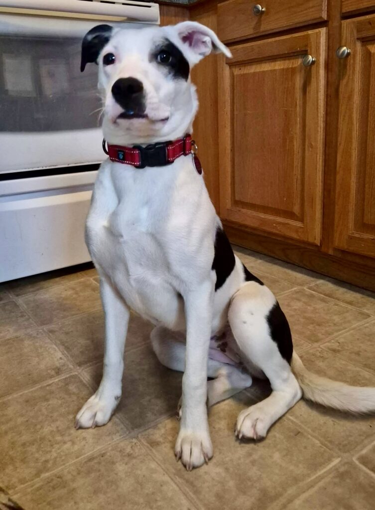Maisy is a young very silly girl, around 6–7 months old and about 33 lbs. She has a black and white coat with a cute spotted ear that makes her easy to pick out in a crowd.