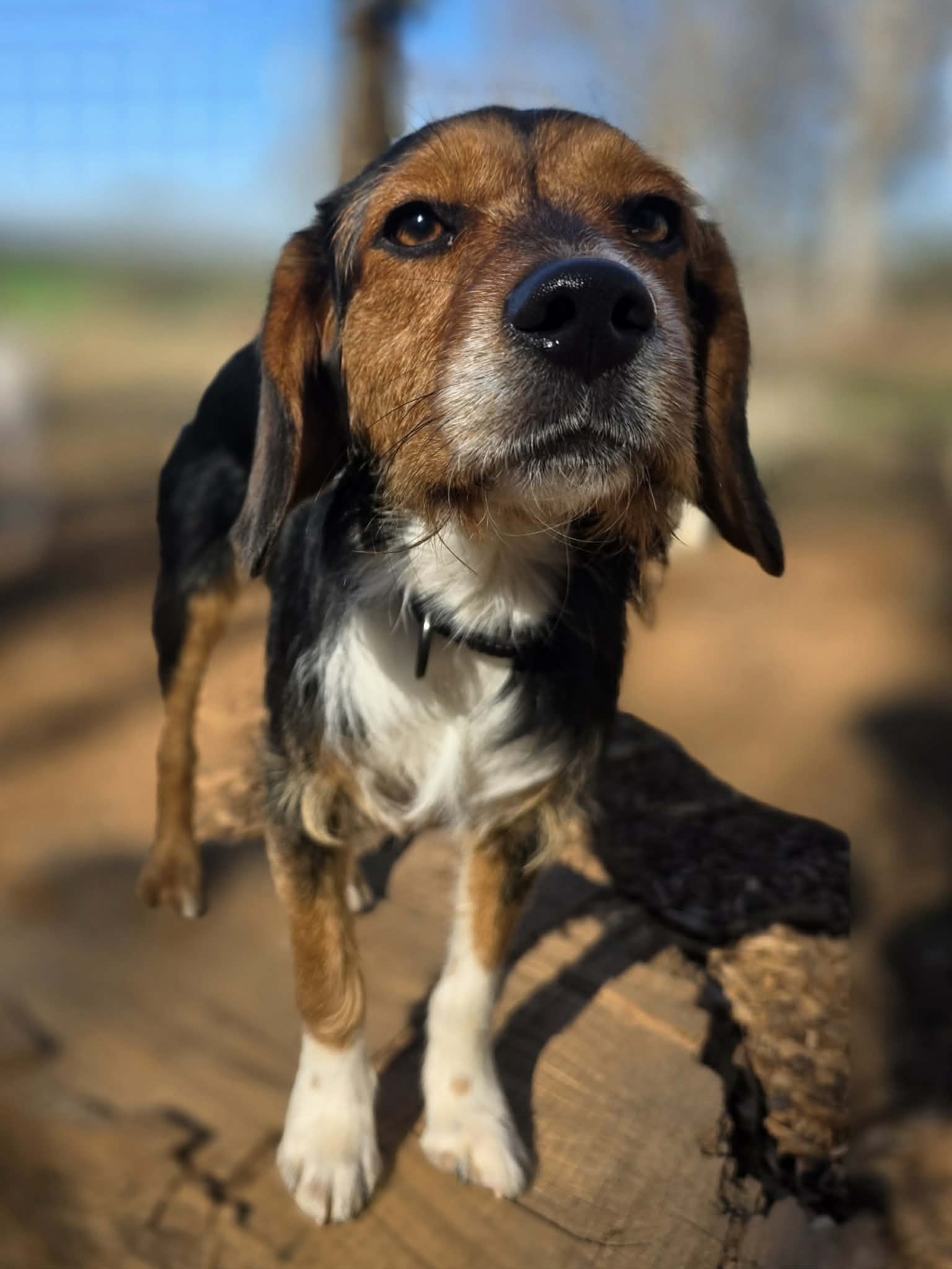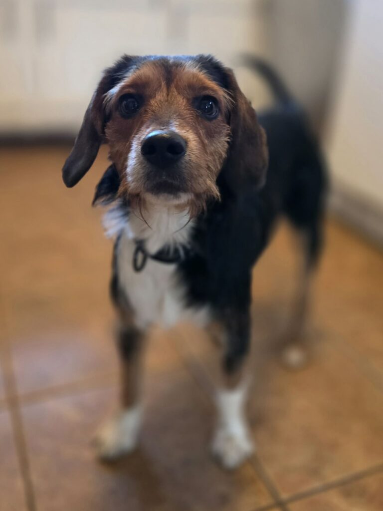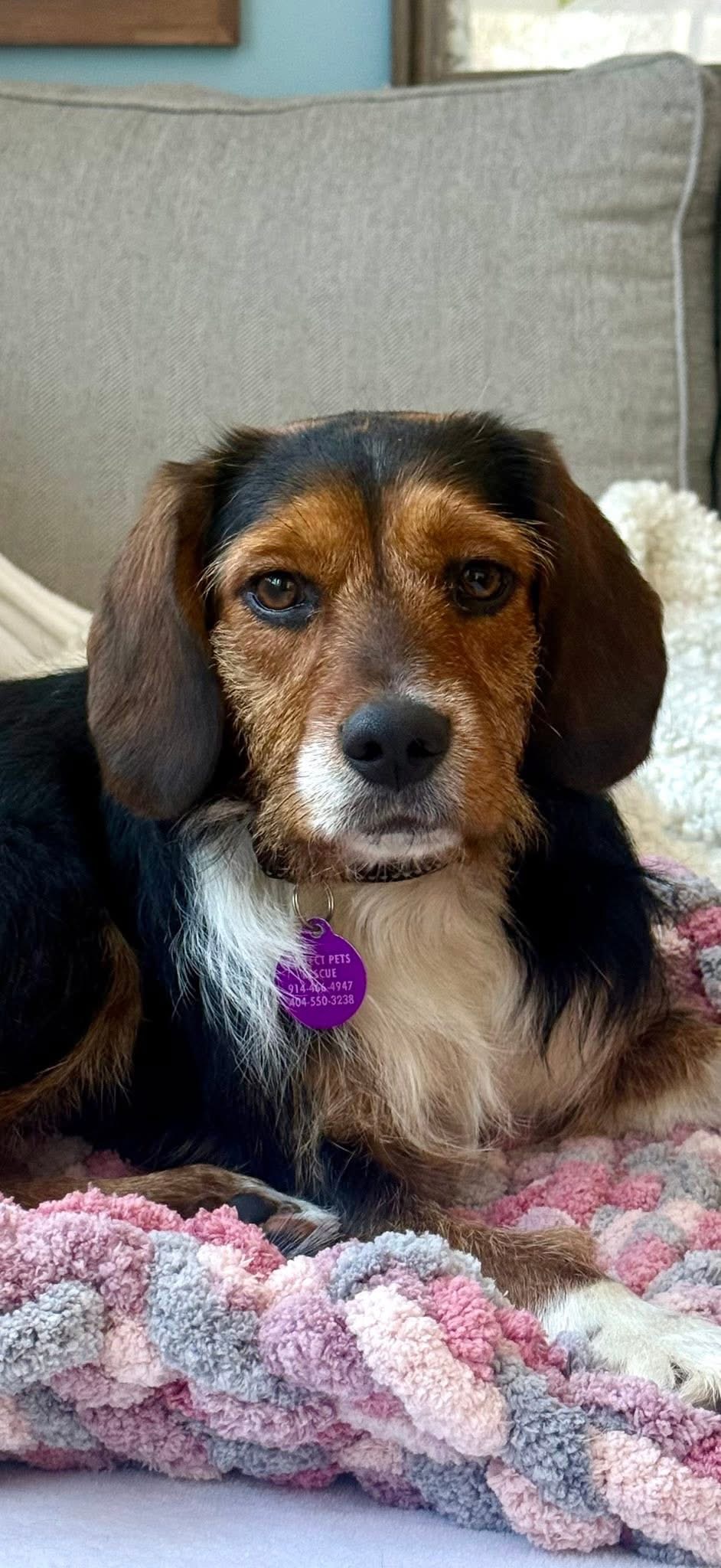 Poppy is a female, about 2 years old and 25 lbs, with all the classic Beagle charm. True to her hound-y nature, she loves to sniff and explore the yard, following her nose wherever it leads.